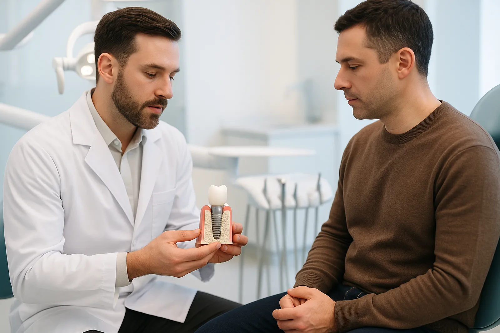 A dental implant is a small titanium post that is surgically placed into the jawbone beneath the gum line. The post functions as an artificial tooth root, and over a period of several months, it fuses with the surrounding bone through a biological process called osseointegration. Once the implant has fully integrated, a custom-fabricated crown, bridge, or denture is attached to the post, creating a replacement tooth that looks, feels, and functions like a natural tooth.
